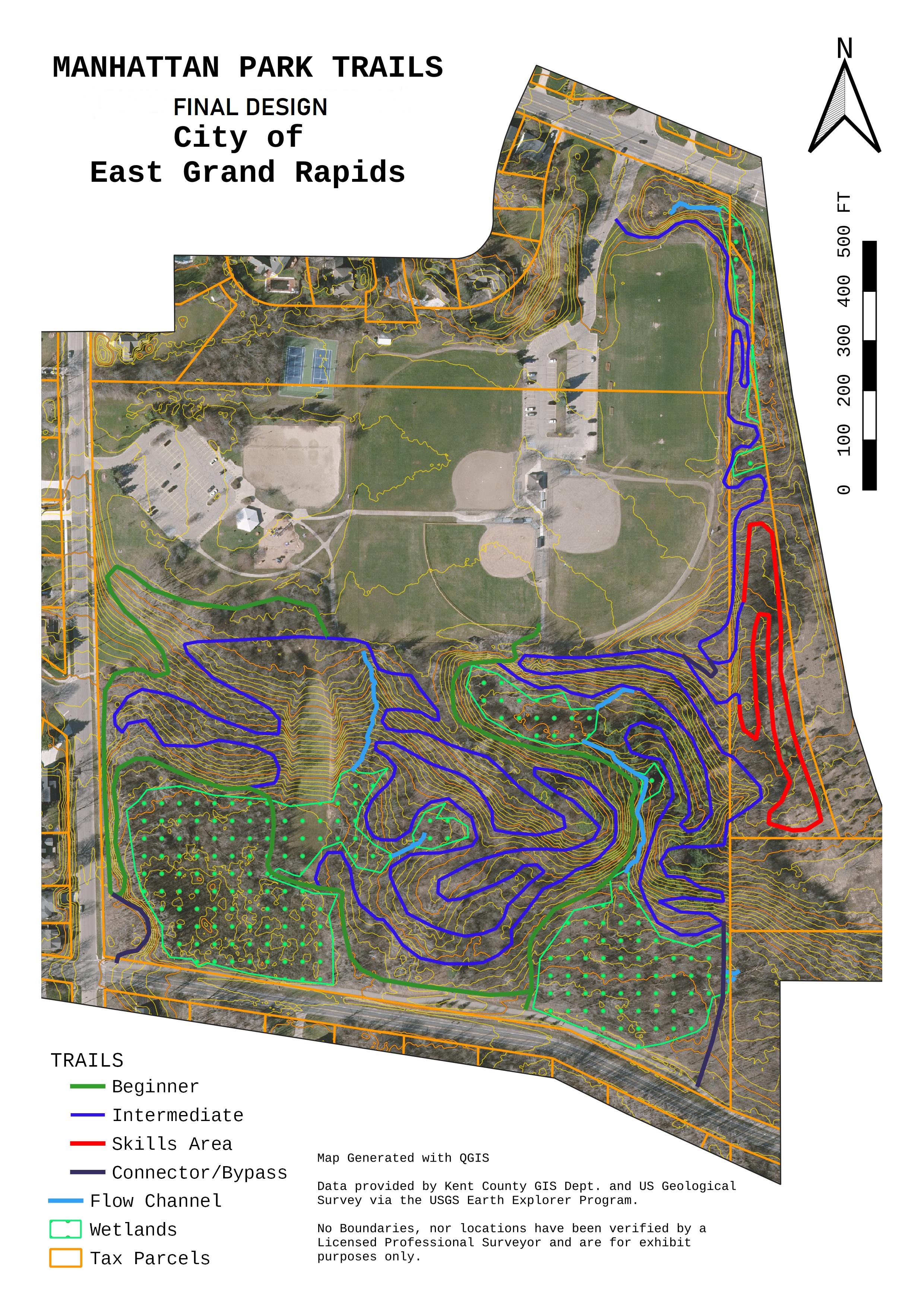 May 2022: The Fred Bunn Trails at Manhattan Park conceptual designs have been included as part of the Community Open House Forums hosted by the City of East Grand Rapids in April and May.  As a result of the feedback from attendees from the input sessions, the Frequently Asked Questions (FAQ) page has been updated.