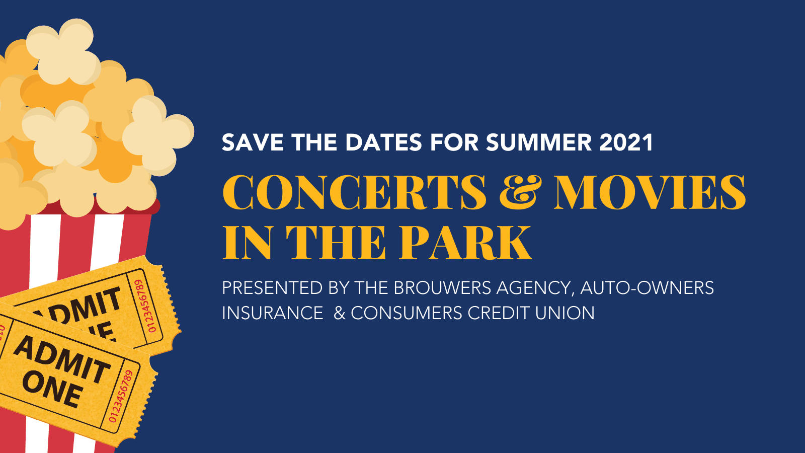 SAVE THE DATES — CONCERTS & MOVIES IN THE PARK Concerts & Movies in the Park, presented by The Brouwers Agency, Auto-Owners Insurance and Consumers Credit Union are back on for Summer 2021! Save the following dates and stay tuned for more details. Concerts - June 14, 21 & 28